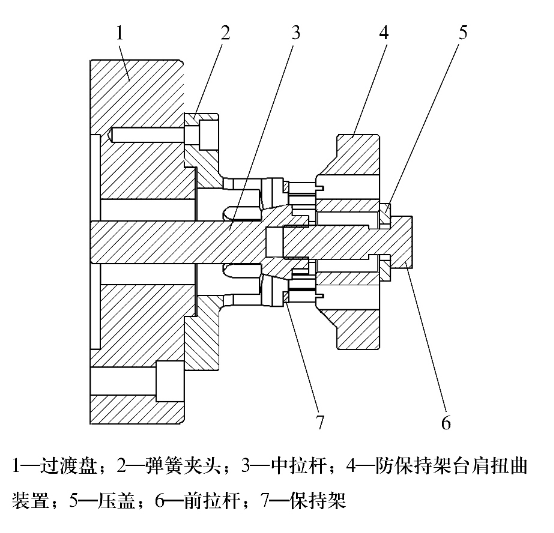 改進(jìn)后的夾具工作原理為:中拉桿連接到機(jī)床活塞桿上,中拉桿左右移動(dòng),其錐面使彈簧夾頭脹大、縮小,實(shí)現(xiàn)銅保持架的夾緊、松開;同時(shí)中拉桿帶動(dòng)前拉桿、壓蓋和防保持架臺(tái)肩扭曲裝置左右移動(dòng),實(shí)現(xiàn)保持架臺(tái)肩的緊固和松開。