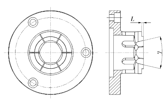 1)彈簧夾頭(圖 3)中夾具夾持面的寬度 L 要比保持架座底厚度(保持架座總高度 - 鉚頭高度- 兜孔深度)小 0. 2 mm 左右,如果 L 值等于或大于保持架座底厚度,銑刀銑削兜孔時(shí)與夾具干涉;L 值取太小,夾具的夾持面變小,銑削兜孔時(shí)保持架容易打滑。